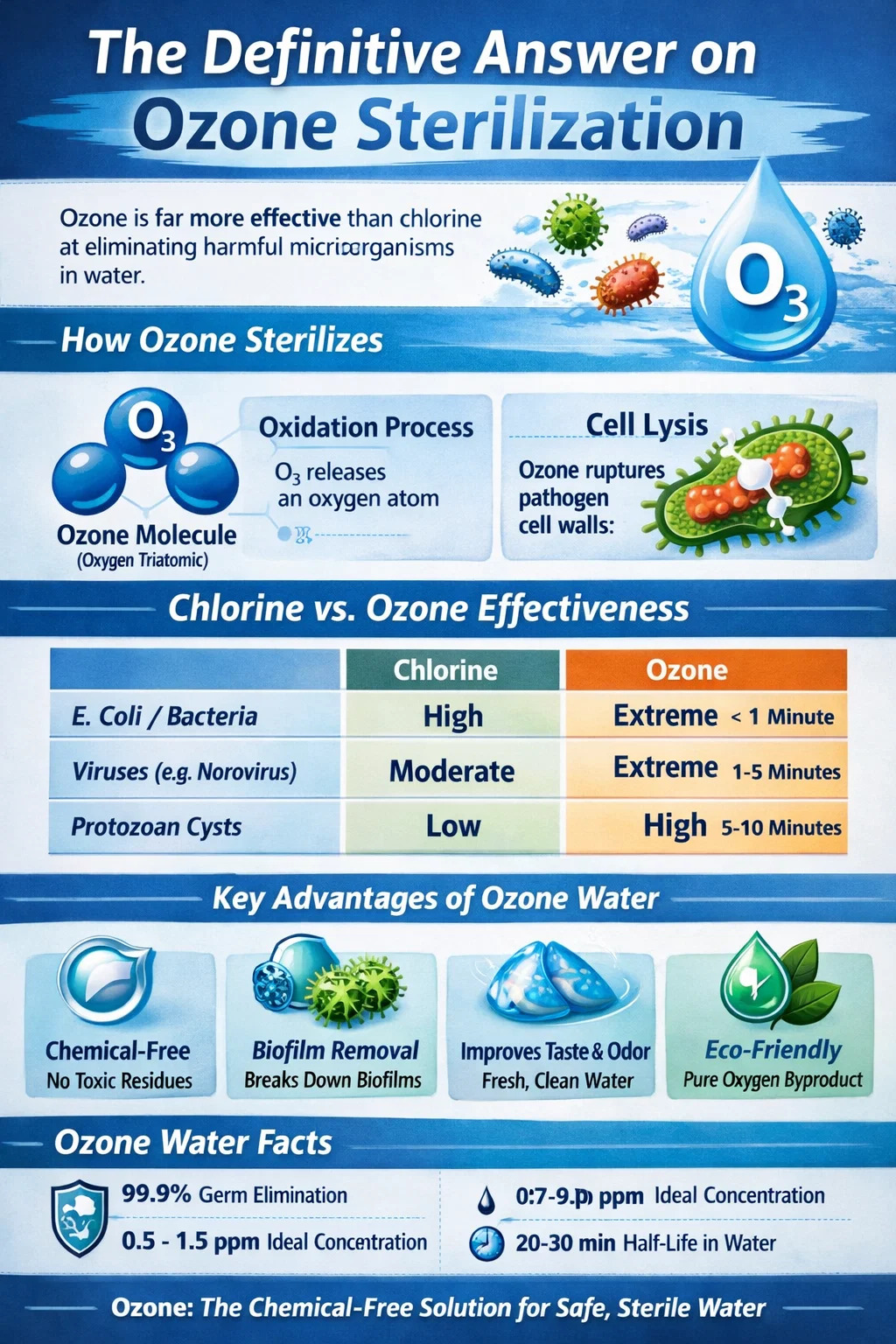 Ano, ozón je dnes jednou z nejvýkonnějších a nejspolehlivějších metod sterilizace vody. Při odstraňování širokého spektra biologických hrozeb je mnohem účinnější než tradiční chlór. Když se rozpustí v kapalině, ozonová voda funguje jako vysoce účinný dezinfekční prostředek, který může dosáhnout a 99,9% snížení škodlivých mikroorganismů včetně bakterií, virů a prvoků, často během několika sekund po kontaktu.