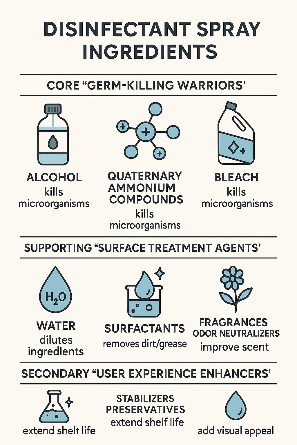 Chcete-li vytvořit efektivní dezinfekční sprej , hlavní "hrdinské" složky lze široce rozdělit takto: